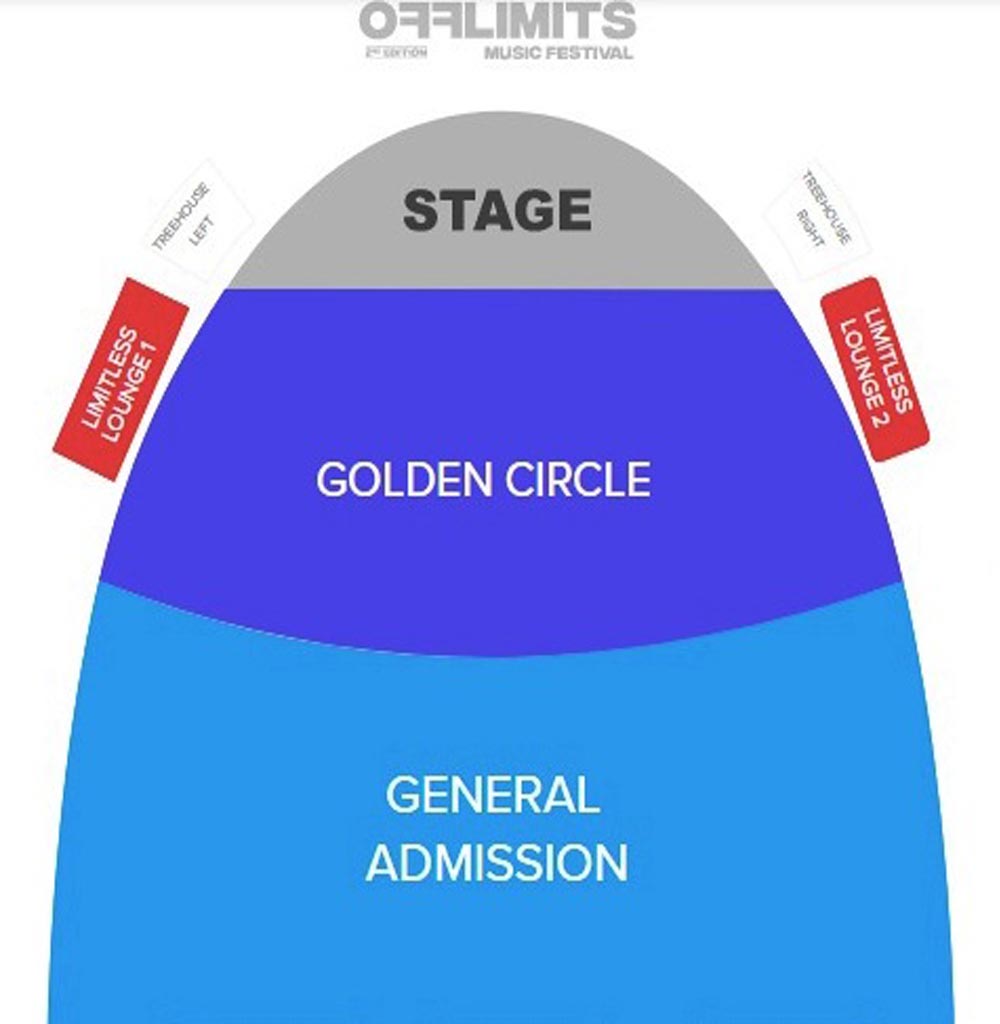 - بلیط ورودی عمومی نمای ایستاده از پشت دایره طلایی را شامل می شود. بلیط دایره طلایی نزدیکترین جایگاه به صحنه است.